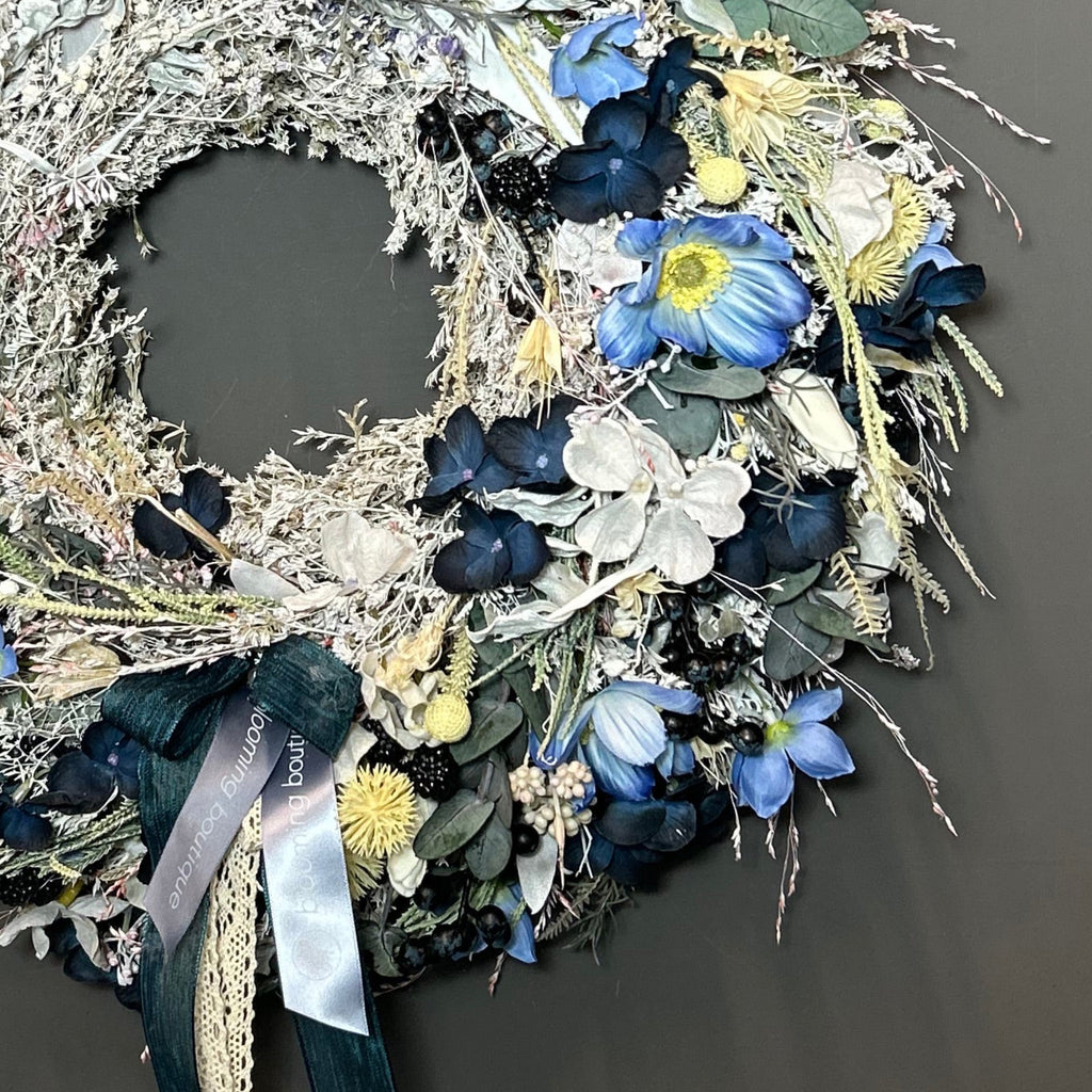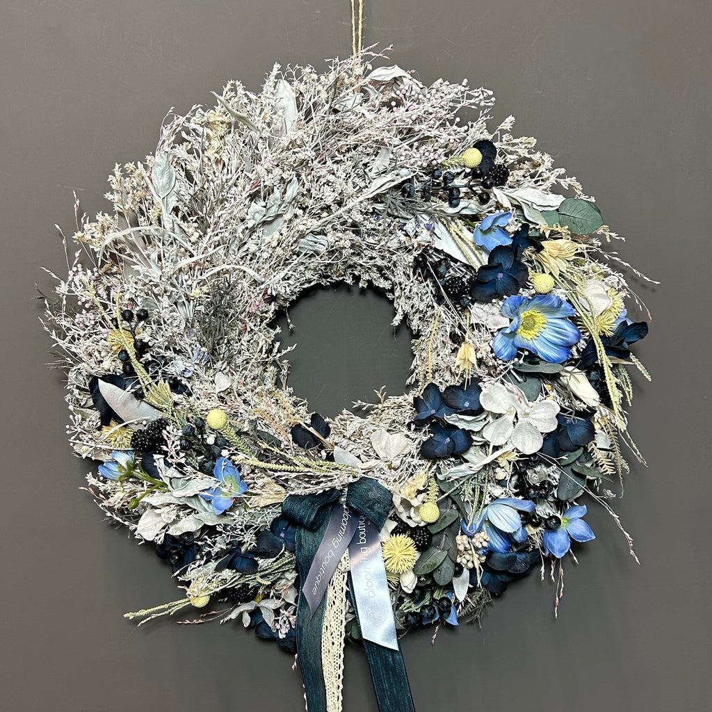 Add a touch of elegance and tranquility to your home with our handcrafted Blue Serenity Wreath. Featuring a graceful blend of soft blue artificial flowers and a natural white base made from dried Limonium and other carefully selected dried blooms, this wreath beautifully balances freshness with lasting charm.