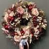 Perfect for gracing your front door, interior walls, or seasonal displays, it creates an inviting atmosphere that celebrates the richness of autumn while hinting at the calm of winter. With its carefully chosen textures and colours, this wreath brings warmth, elegance, and a soft seasonal glow to any space—year after year.