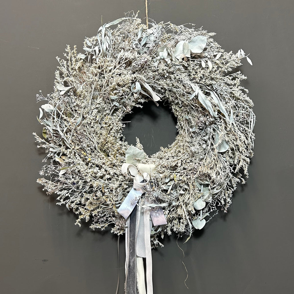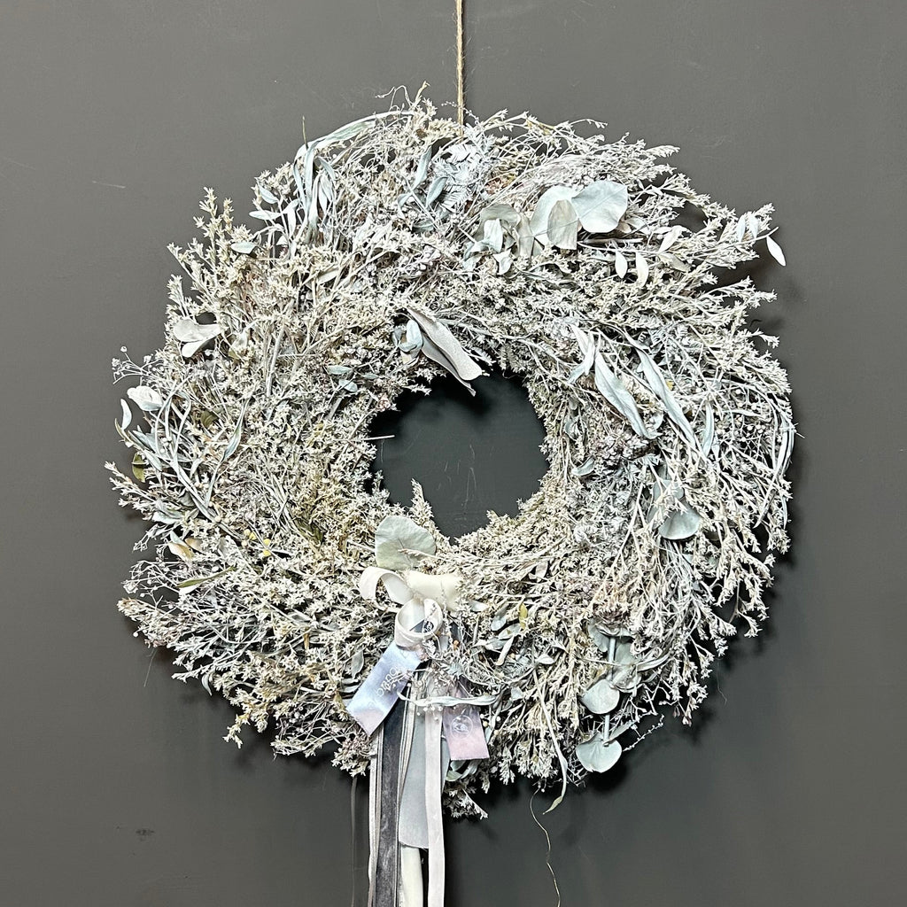 The soft, airy texture of limonium creates a refined and understated look, evoking the quiet beauty of a winter landscape. Finished with care, this wreath makes a striking statement on any door, wall, or interior space—perfect as a thoughtful gift or a lasting addition to your home décor.