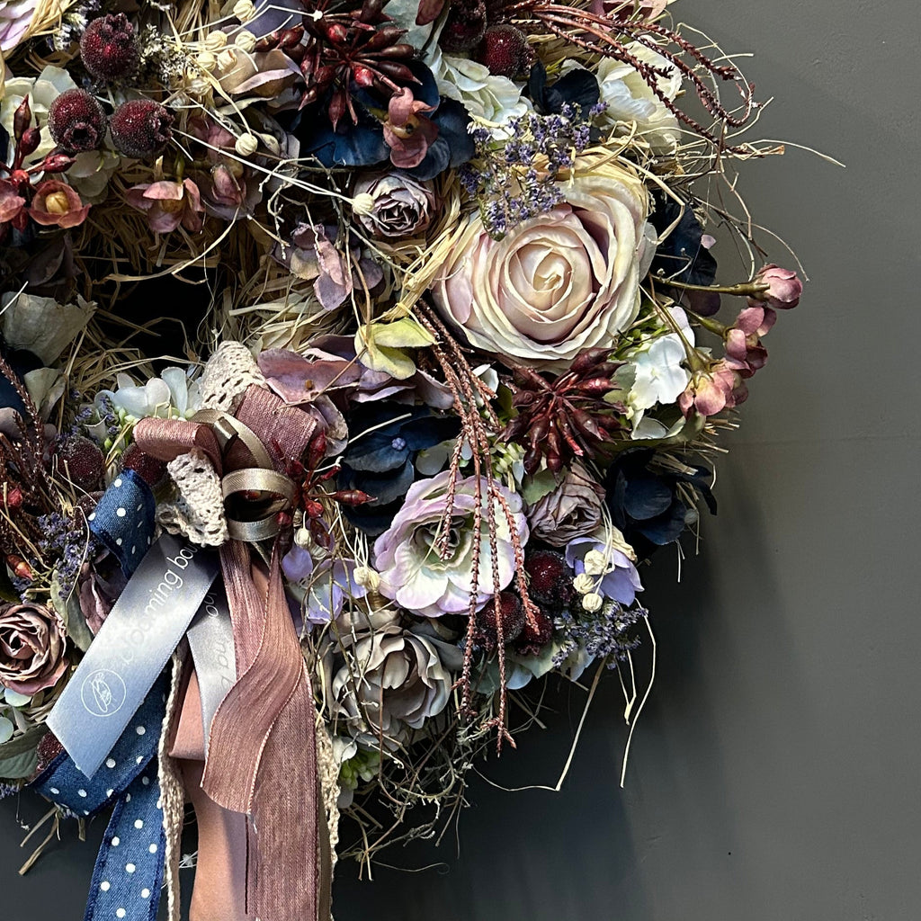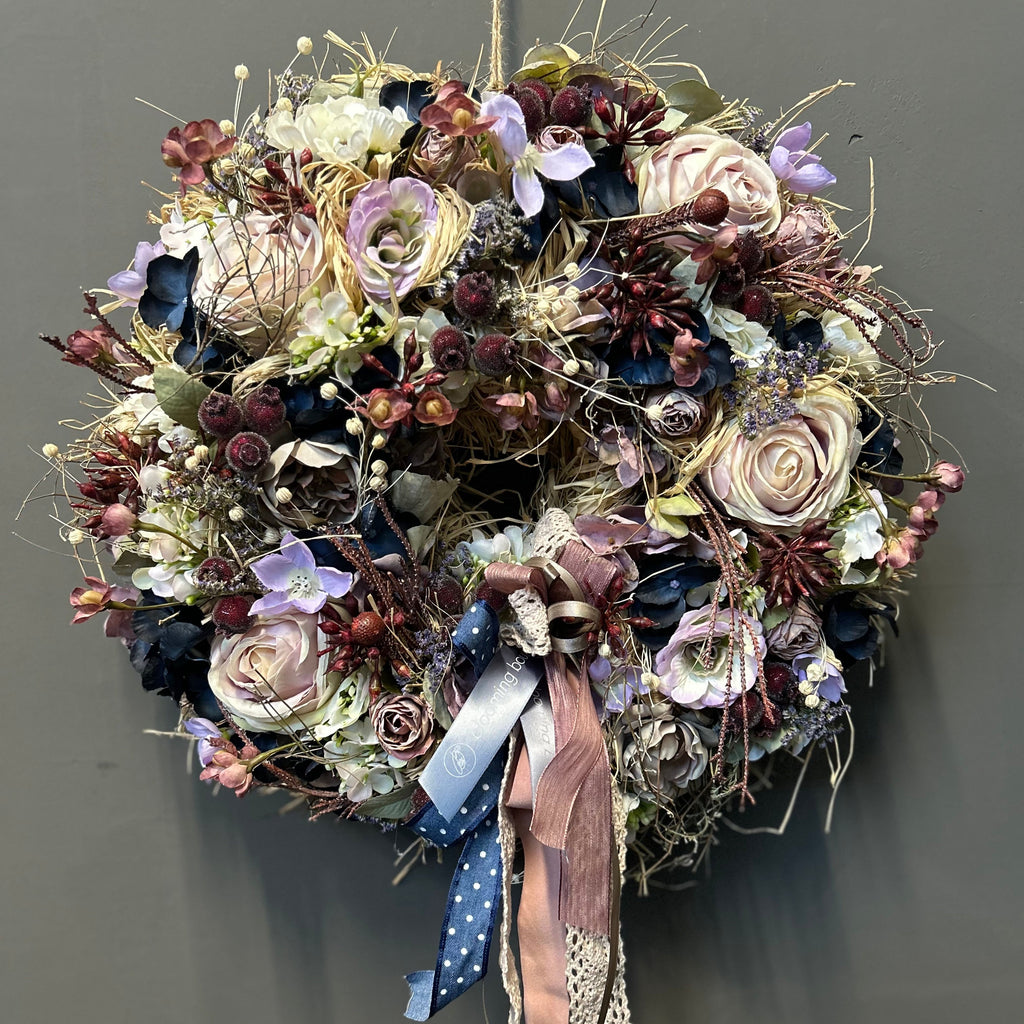 Rustic Pink, Dark Blue, Lilac, Wine & Natural 43 cm Wreath – A Timeless Floral Accent
