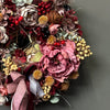 Add a touch of timeless beauty to your home with this exquisite 40cm dried and artificial flower wreath. Designed in a stunning palette of wine, cream, red, orange and shades of pink. Accented with natural raffia and carefully selected decorative elements, this piece offers a charming blend of rustic elegance and lasting durability.