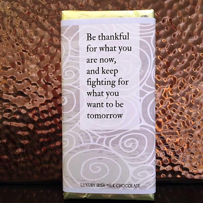 Chocolate bars are wrapped in a traditional gold foil & paper wrap, individually presented in a (biodegradable) cello envelope for protection
