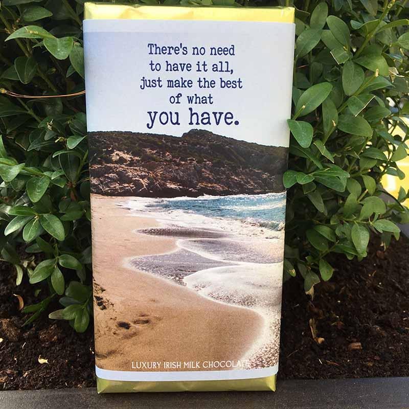 Chocolate bars are wrapped in a traditional gold foil & paper wrap, individually presented in a (biodegradable) cello envelope for protection